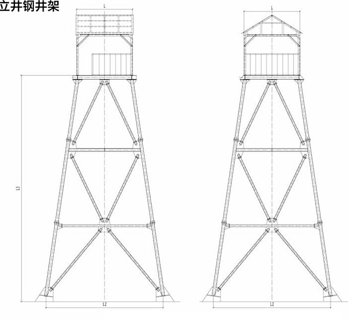 以上所列立井鑿井井架均為鋼管井架,包括五個型號共七種。本井架系列可滿足井徑3.5~8.0cm,井深200~1000m的立井井筒施工及其工藝要求,其中V型井架更適用于采用大型機械化配套設備的深井施工。
